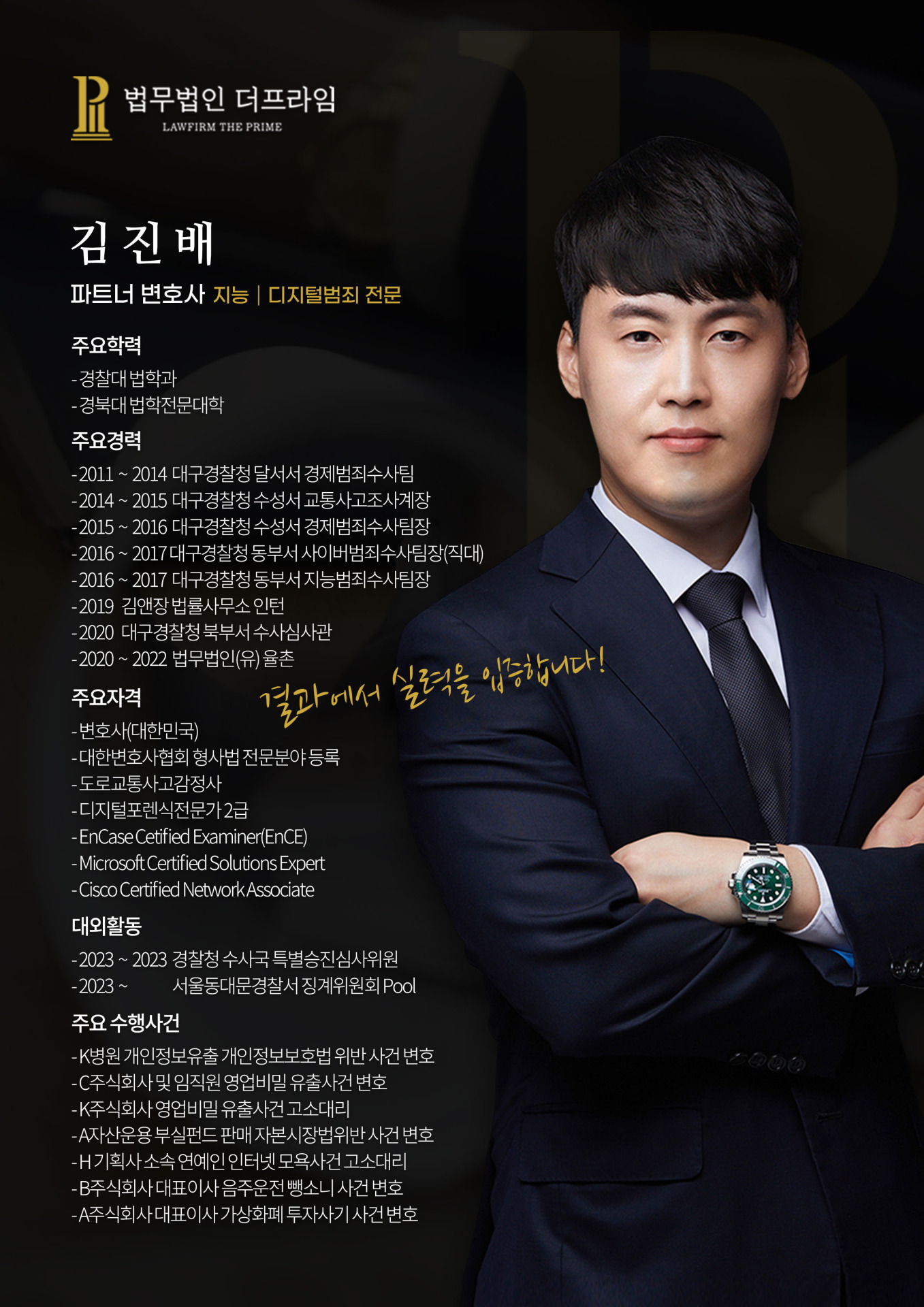 다행히 더프라임을 늦지 않게 찾아오셔서 디지털 포렌식, 모의수사, 조사동행, 법률 의견서 등의 더프라임의 종합적인 조력을 받음으로 인해 크나큰 범죄의 혐의를 벗을 수 있었습니다.